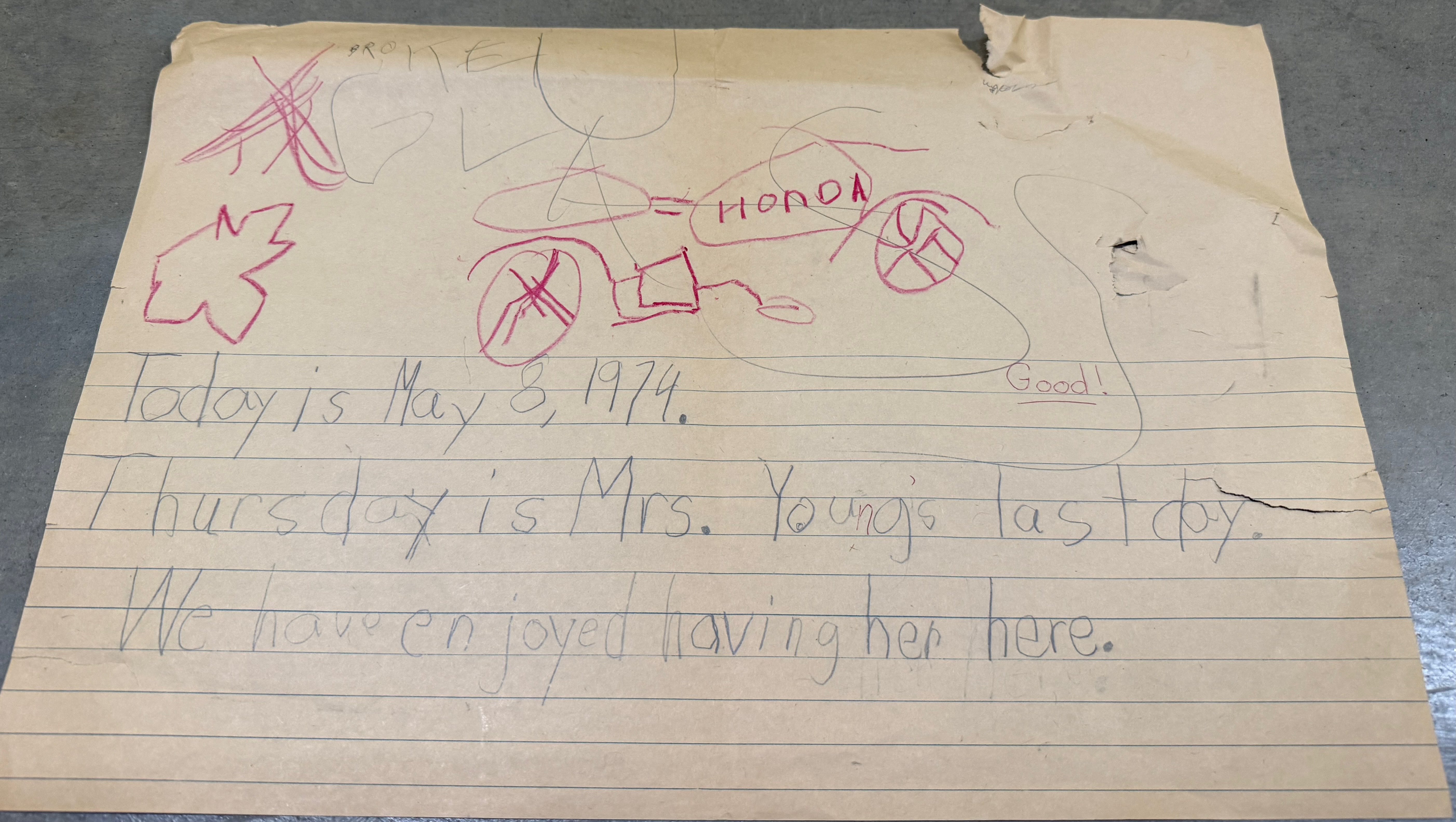 Coda 2: I ended up having to go to our storage unit, but I finally found a stash of my old schoolwork, from kindergarten. Unfortunately, I couldn’t find anything labeled “WORKS TOO FAST,” although I know said work likely exists somewhere, probably at my mother’s house. So instead, I’ll show you a masterpiece from kindergarten. I think the artwork is supposed to be a motorcycle, as seen through the broken windshield of a car, which I very clearly labeled BROKE GLASS by way of explanation. Mrs. Young was the student teacher in that class. Crazy to think that wherever Mrs. Young is now, she’s well into her 70s.